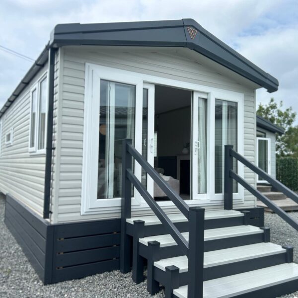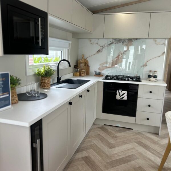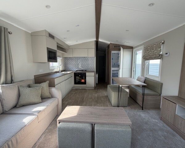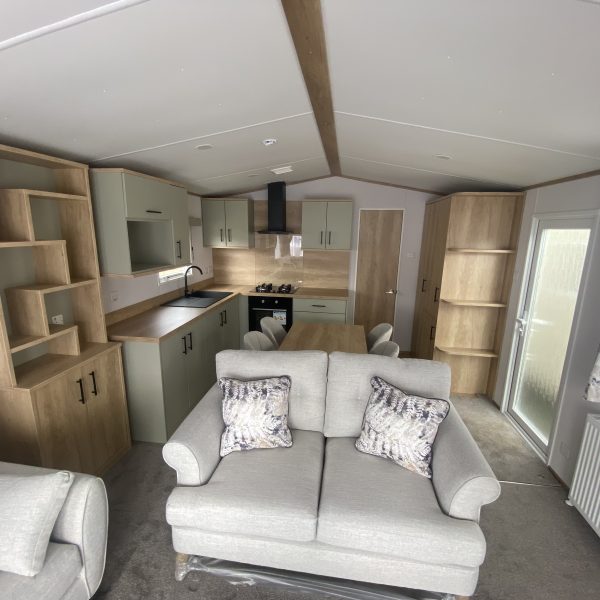 Spacious open plan living area with outlook sliding doors to front Integrated fridge freezer and microwave Double bedroom One twin bedroom Shower / toilet room