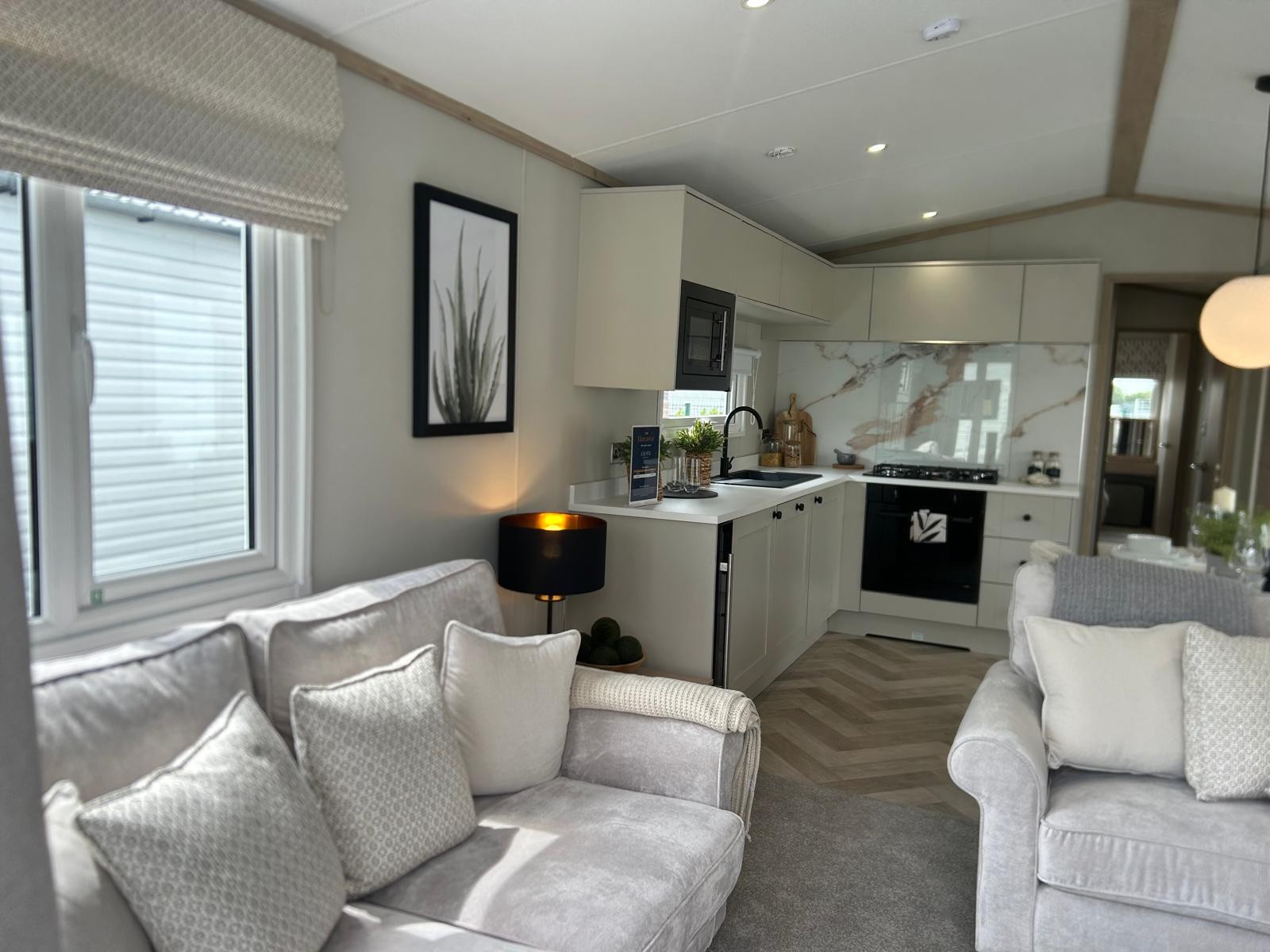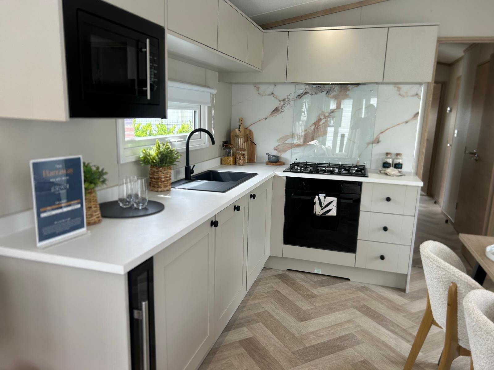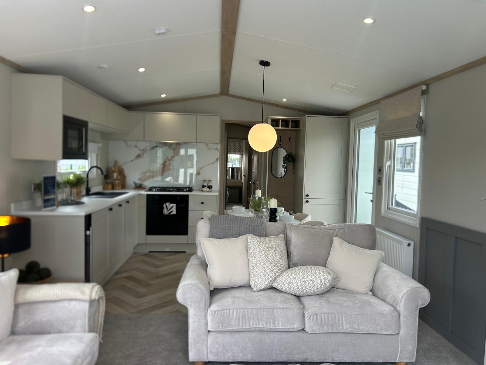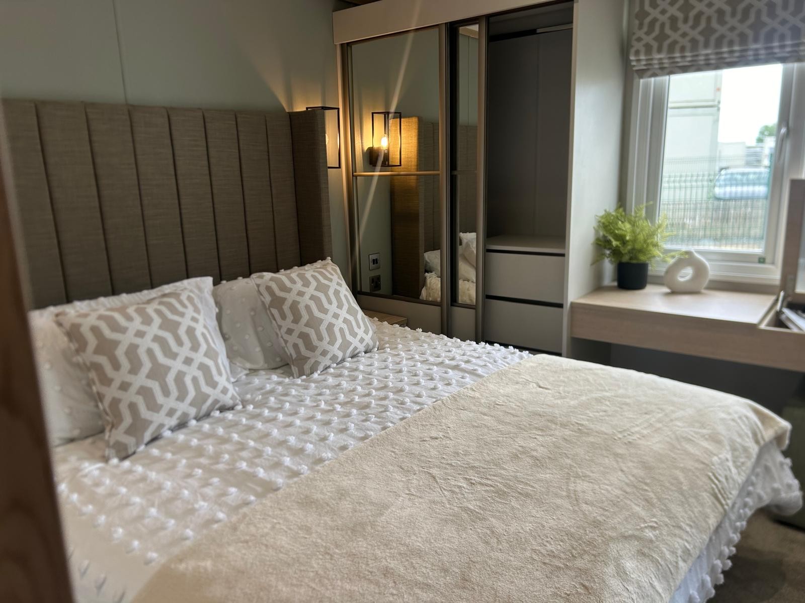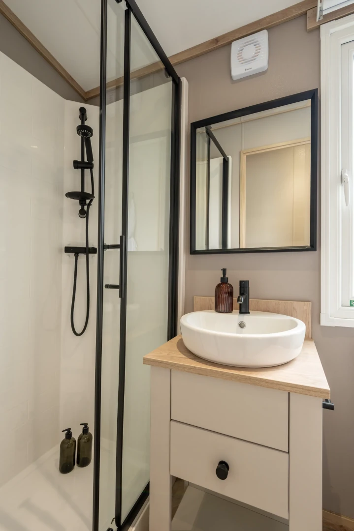 Sleek, modern cabinetry in soft neutrals are paired with a striking marble-effect splashback. Open, bright and connected to lounge area. Integrated appliances (fridge freezer & microwave) and plentiful storage Dining table framed by cosy upholstered chairs sits at heart of the open space Two freestanding soft neutral sofas and fireplace with room to fix tv on wall above Bedrooms Spacious master bedroom features a generous double bed with a statement headboard, mirrored wardrobes and stylish dressing area One twin room, and 2 single bedrooms ensuring privacy and flexibility, making it ideal for family, friends or guests. Bathrooms Modern design with everyday comfort- sleek vanity unit with countertop basin, matt black fixtures and a generous mirror. Two showers in this caravan. |