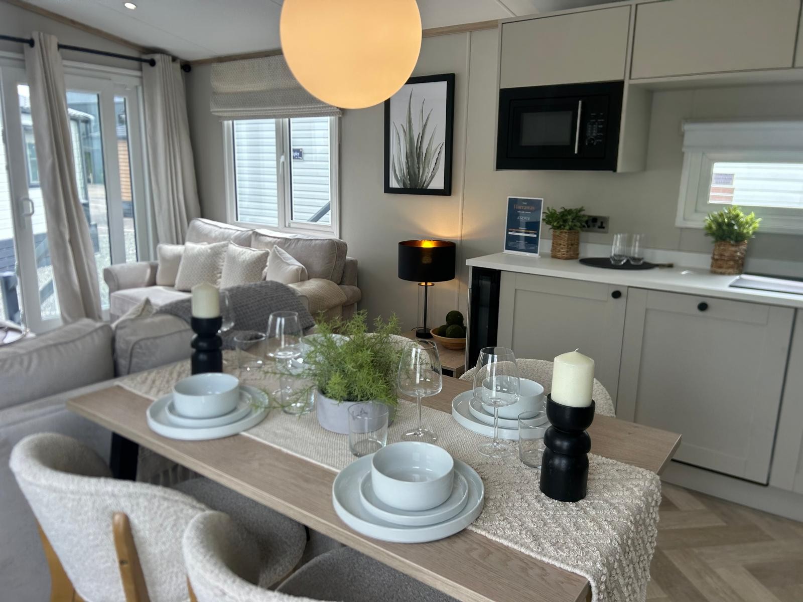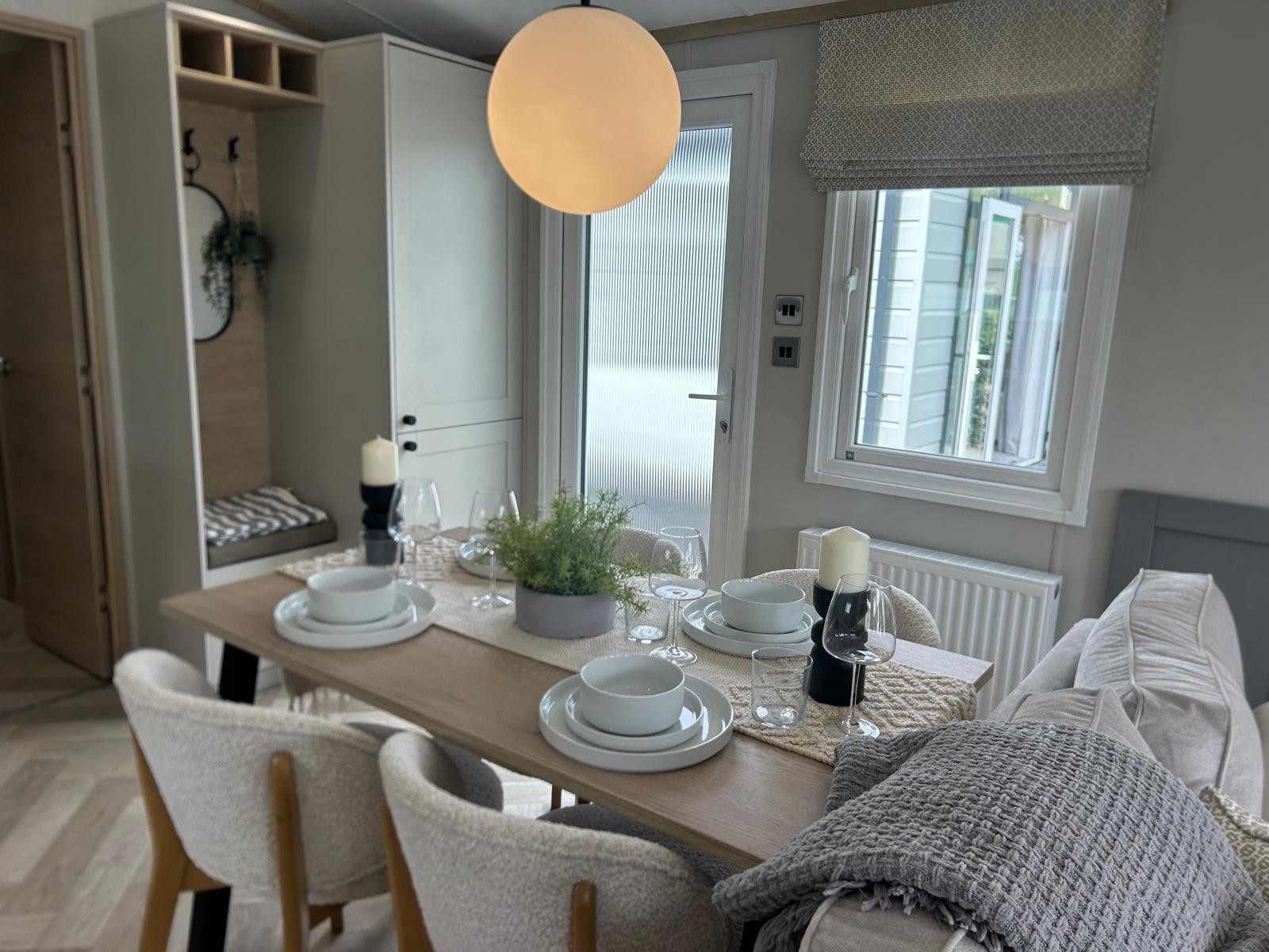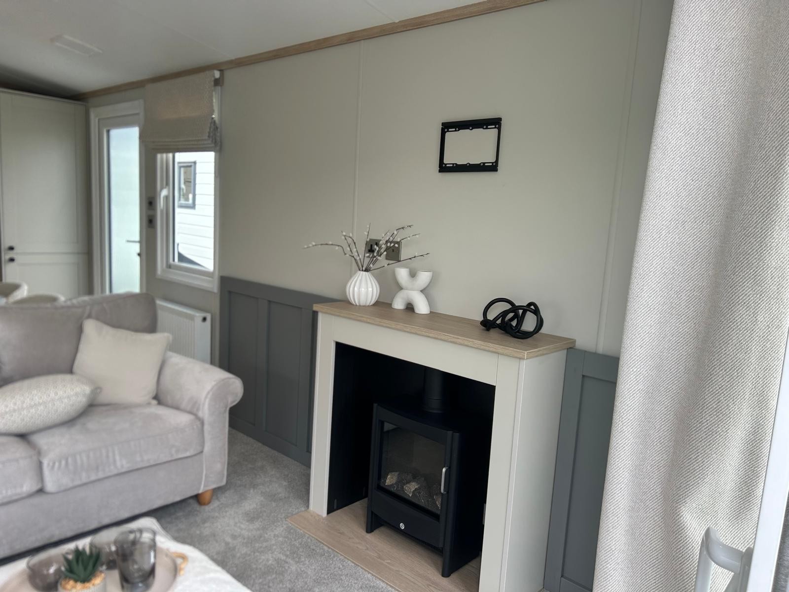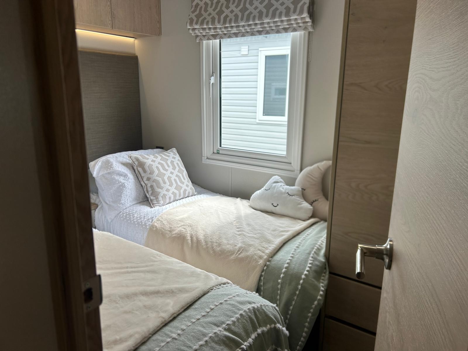 Sleek, modern cabinetry in soft neutrals are paired with a striking marble-effect splashback. Open, bright and connected to lounge area. Integrated appliances (fridge freezer & microwave) and plentiful storage Dining table framed by cosy upholstered chairs sits at heart of the open space Two freestanding soft neutral sofas and fireplace with room to fix tv on wall above Bedrooms Spacious master bedroom features a generous double bed with a statement headboard, mirrored wardrobes and stylish dressing area One twin room, and 2 single bedrooms ensuring privacy and flexibility, making it ideal for family, friends or guests. Bathrooms Modern design with everyday comfort- sleek vanity unit with countertop basin, matt black fixtures and a generous mirror. Two showers in this caravan. |